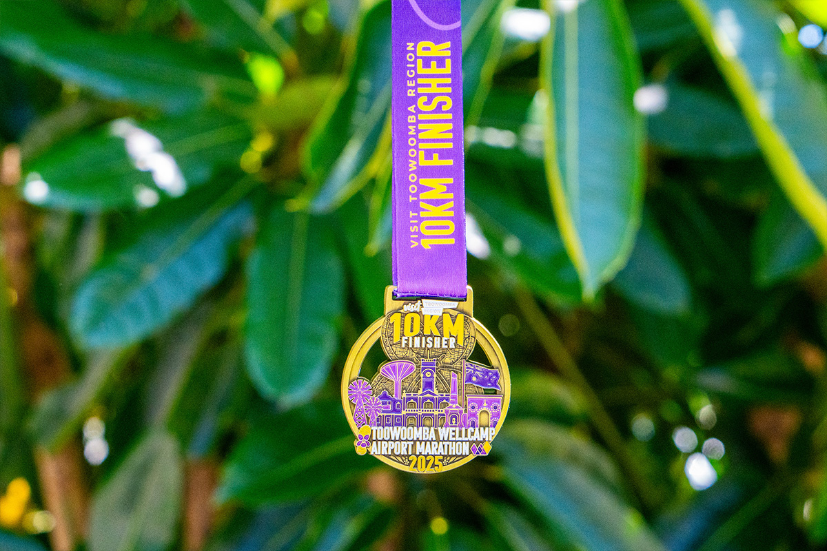 One hundred days to go until the event will be marked by the release of the design for this year’s Toowoomba Wellcamp Airport Marathon, ASICS Half Marathon and the Visit Toowoomba Region 10km medals which feature iconic landmarks and the distinct colouring of Toowoomba’s historic floral emblem, the sweet violet.